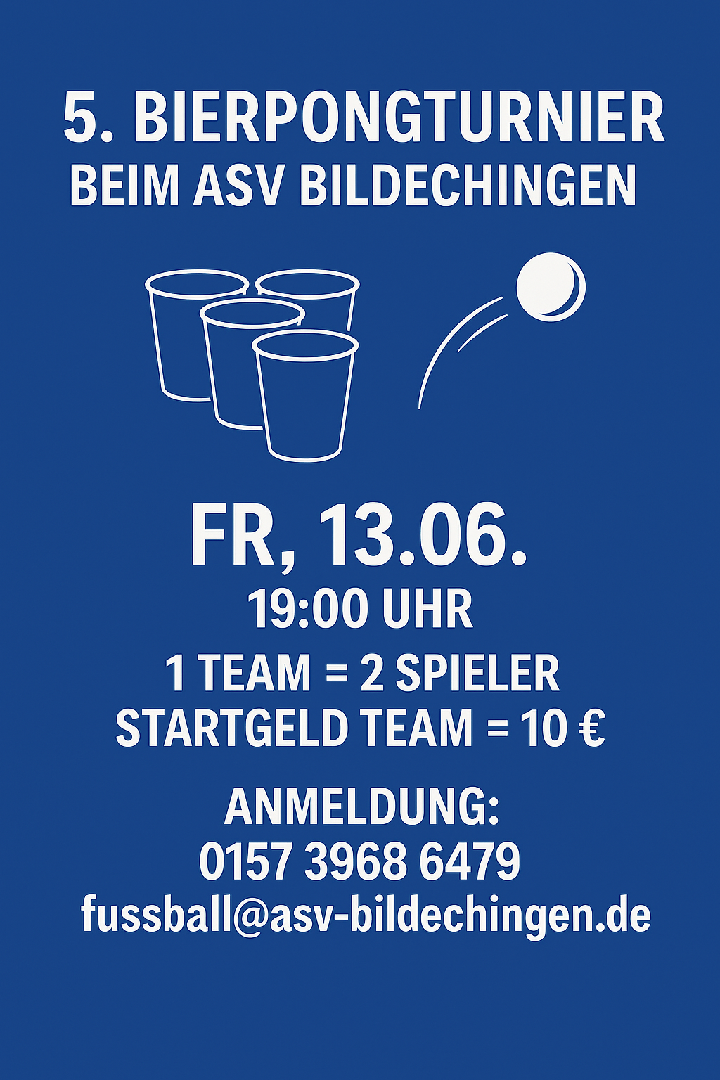 Der ASV Bildechingen veranstaltet am Freitag, den 13. Juni 2025, sein bereits 5. Bierpongturnier im Sportheim. Beginn ist um 19:00 Uhr. Nach dem großen Zuspruch der Vorjahre dürfen sich Teilnehmende wie Zuschauer erneut auf einen feucht-fröhlichen Abend mit sportlichem Ehrgeiz, Spaß und Geselligkeit freuen.